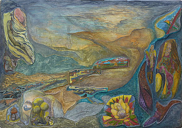 Diverse materials, media and techniques (printing paper, matboard, illustration board, acrylic gel/medium/modelling paste, varnish, pen and ink drawing, photography, digital printing, pigmented acrylic ink and oil painting) on lauan panelling(1/8"), wood frame
