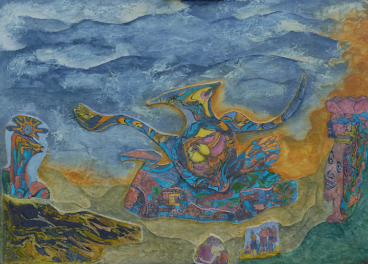 Diverse materials, media and techniques (printing paper, matboard, illustration board, acrylic gel/medium/modelling paste, plaster compound, acrylic resin glaze, Damar varnish, pen and ink drawing, photography, digital printing, marouflage, pigmented acrylic ink and oil painting) on lauan (1/8" wood) panelling and wood frame.