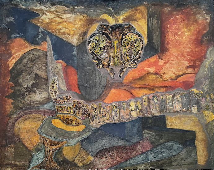 Diverse materials, media and techniques (printing paper, matboard, illustration board, acrylic gel/medium/modelling paste, plaster compound, acrylic resin glaze, Damar varnish, pen and ink drawing, photography, digital printing, pigmented acrylic ink and oil painting) on 1/4" woodpanel .
